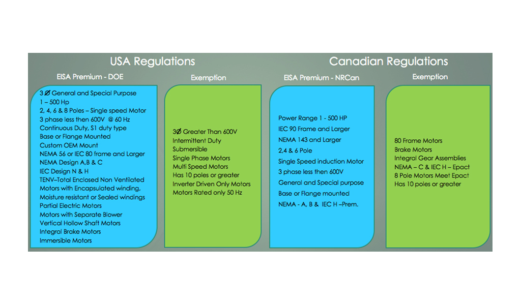 La direttiva americana infatti allarga il campo di applicazione a nuovi motori precedentemente esclusi: viene aggiunta la taglia IEC80, la taglia IEC100, la categoria dei Partial Motor, tra i quali i motori senza flangia e cuscinetto anteriore (forma IM B9) e infine i motori compresi nell'attuale livello EPAct IE2, Energy Efficient Table 12-11. L'estensione prevede l'innalzamento dell'efficienza di tutti questi motori al livello IE3, NEMA Premium Table 12-12.