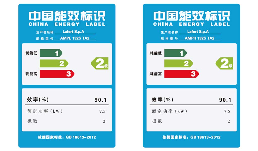 La China Energy Label attesta ufficialmente il rispetto dei valori minimi ammissibili di efficienza energetica in Cina. I motori asincroni trifase di piccole e medie dimensioni, 2, 4 e 6 poli, con un range di potenza da 0.75kW a 375kW, fino a 1000V - 50Hz, devono soddisfare i requisiti specificati dallo standard GB 18613-2012, che specifica tre diversi livelli di efficienza energetica, Grade 1-3, dove il Grade 1 rappresenta la performance best-in-class (IE4).