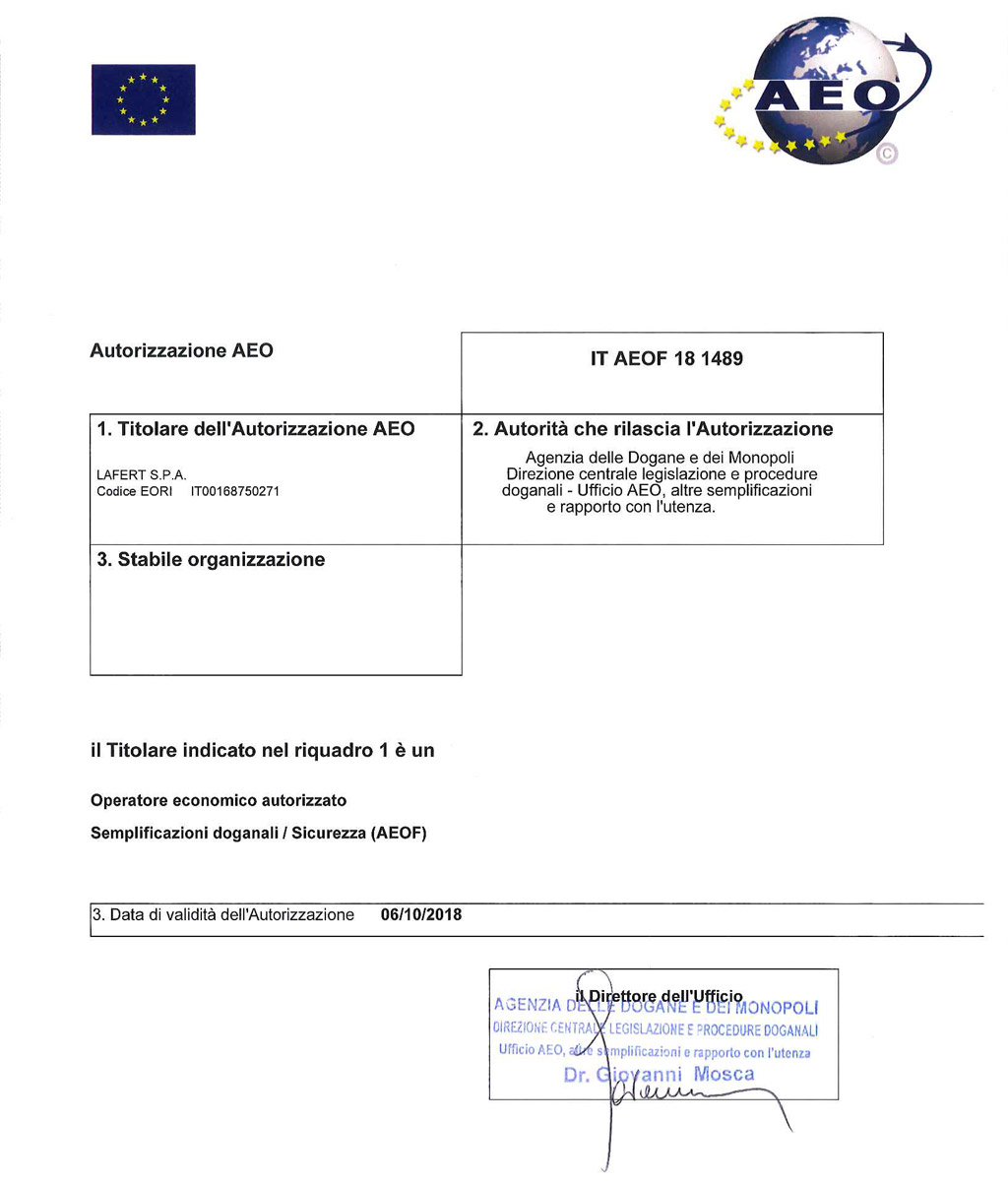 Lafert ha ottenuto la Certificazione AEO di Operatore Economico Autorizzato (autorizzazione n. IT AEOF 18 1489), rilasciata dalle Autorità doganali. "Un importante e autorevole riconoscimento che – esordiscono i vertici del Gruppo Lafert - attesta l’affidabilità e la sicurezza di Lafert nei confronti del mercato, garantisce la solvibilità finanziaria e certifica adeguati standard di competenza e qualifiche professionali e di sicurezza dei processi legati alla logistica".
