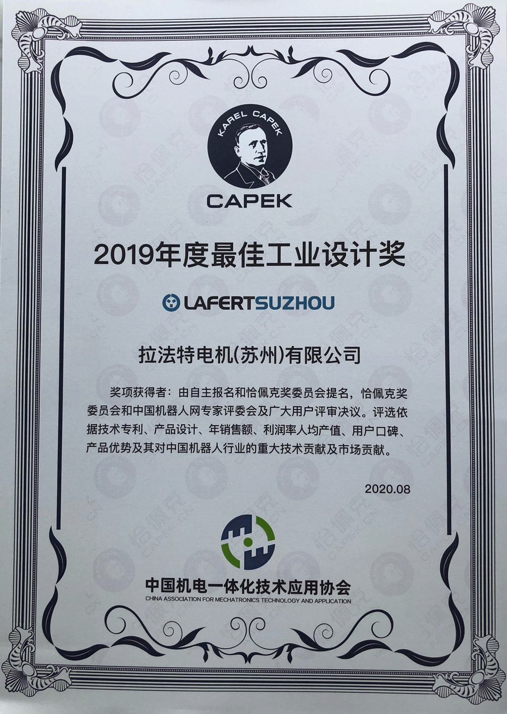 Il 28 agosto 2020 si è svolta a Wuhu, nella provincia cinese di Anhui, la 6° Cerimonia di Premiazione del Capek Prize in contemporanea alla 10° edizione del China International Robot Summit Forum. Lafert (Suzhou) Co., Ltd., in qualità di player globale di componenti per la robotica, è stata invitata alla cerimonia e si è aggiudicata il premio Capek "Best Industrial Design".