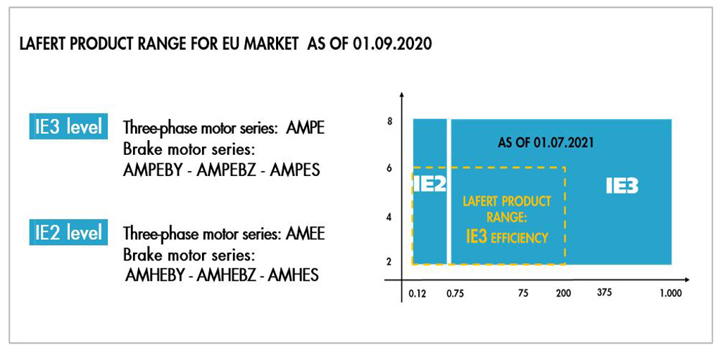 Inoltre, per incontrare le esigenze di quei clienti fortemente focalizzati sull'efficienza energetica, Lafert è in grado di offrire la stessa gamma di motori trifase da 0.12 a 0.55 kW anche con livello di efficienza IE3, così anticipando ulteriori incrementi dei livelli minimi di efficienza e garantendo un importante vantaggio competitivo al mercato dell’UE e ai suoi clienti.