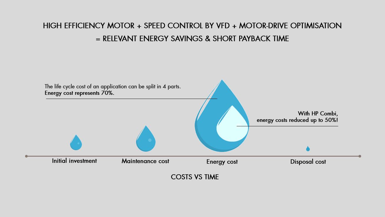 Il massimo controllo della velocità grazie al VFD, l’ottimizzazione del sistema garantita da un unico fornitore e il nostro motore ad altissima efficienza con magneti permanenti permettono un risparmio energetico e una riduzione dei costi per l'approvvigionamento energetico anche fino al 50%.