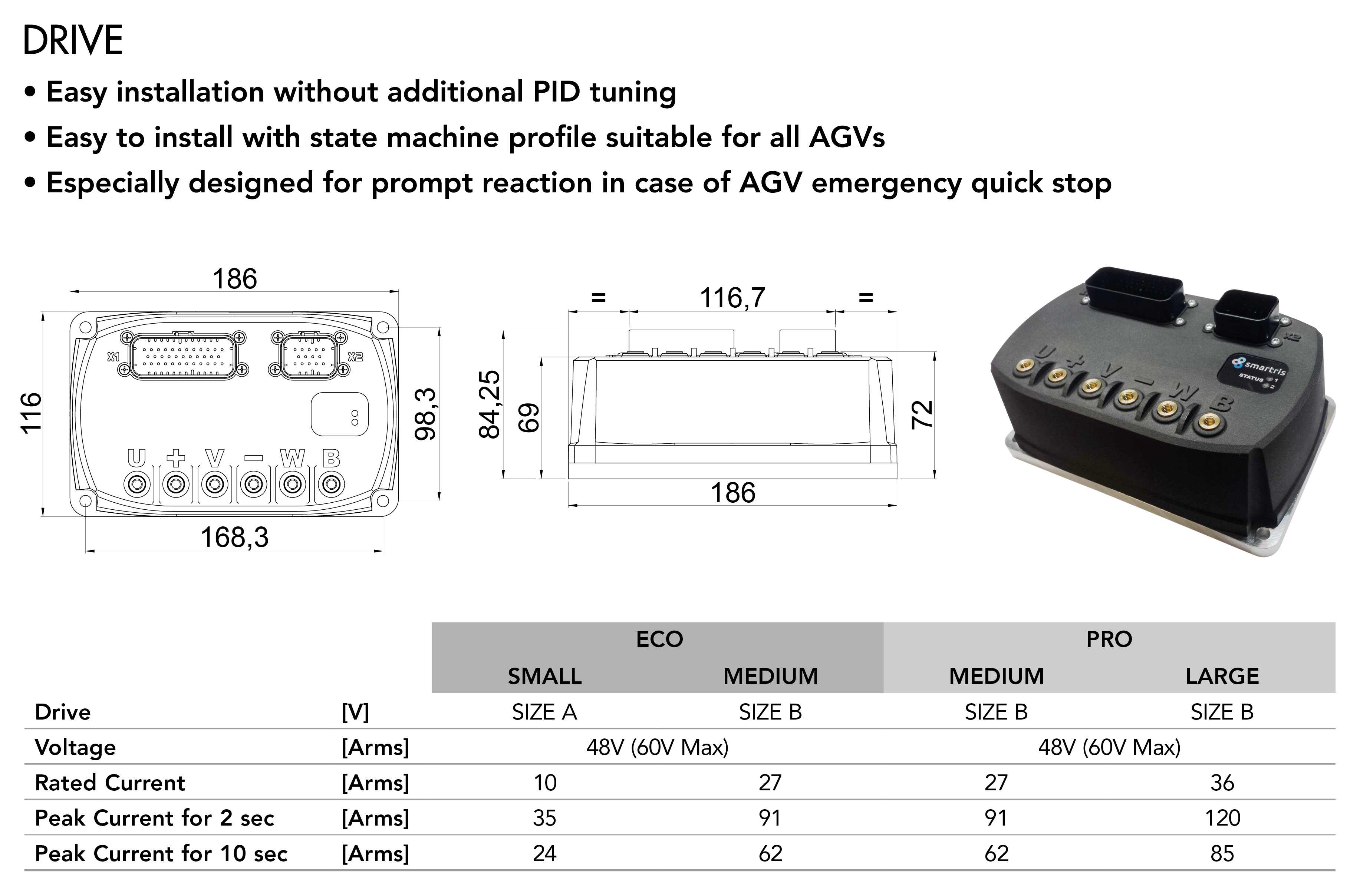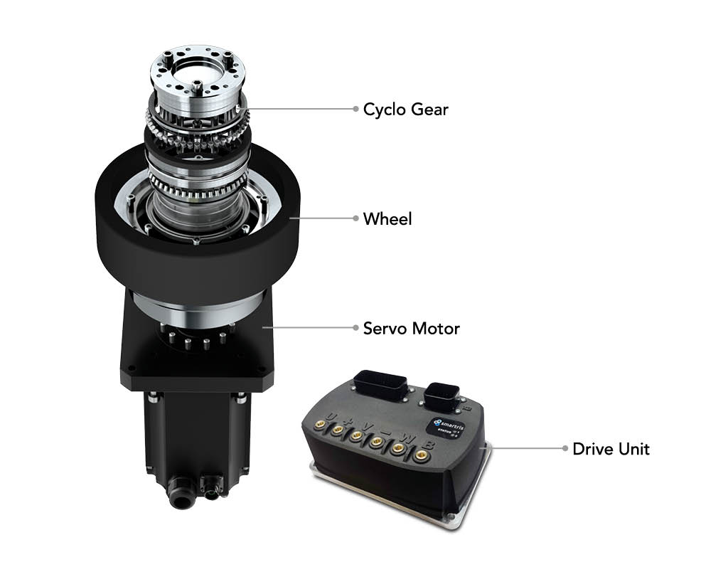 Smartris è una soluzione integrata per AGV composta da riduttore, servomotore, azionamento e ruota. Sviluppato per vari tipi di veicoli a guida automatica (AGV) è in grado di offrire alte prestazioni, massima precisione e affidabilità dei componenti integrati.